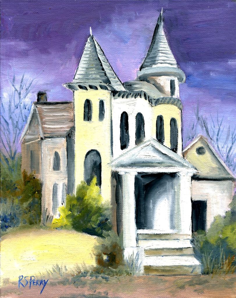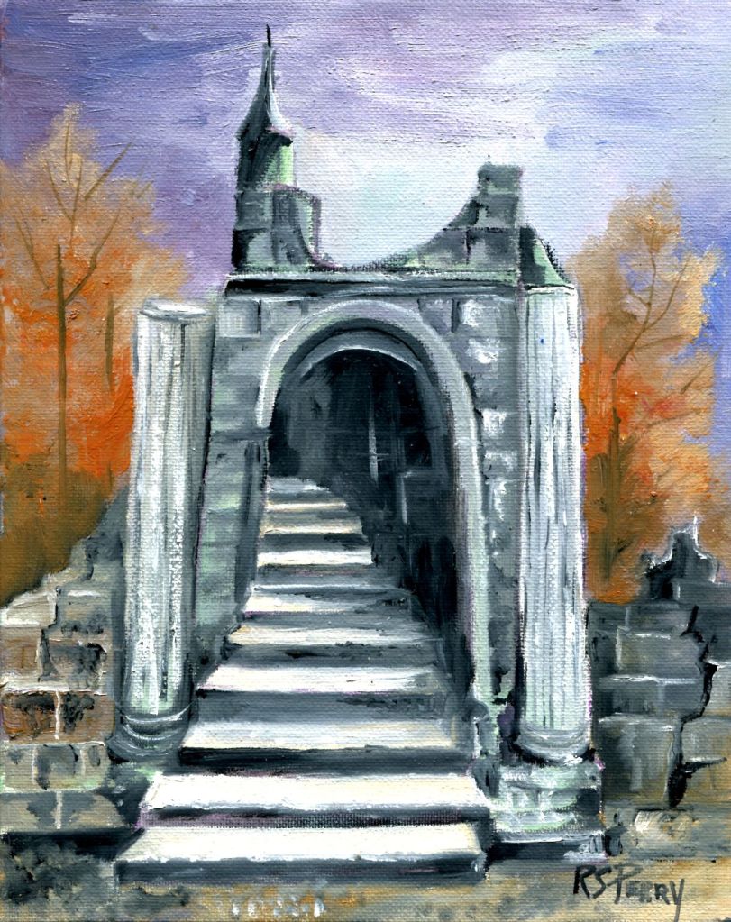 Imagination is working over-time lately. I think that the subconscious is trying to say that there is a lot we will never know about ourselves, and plenty to be discovered if we can only get the courage to go up these stairs into an unknown area, which I admit, looks pretty bleak. This oil painting is 10 x 8.