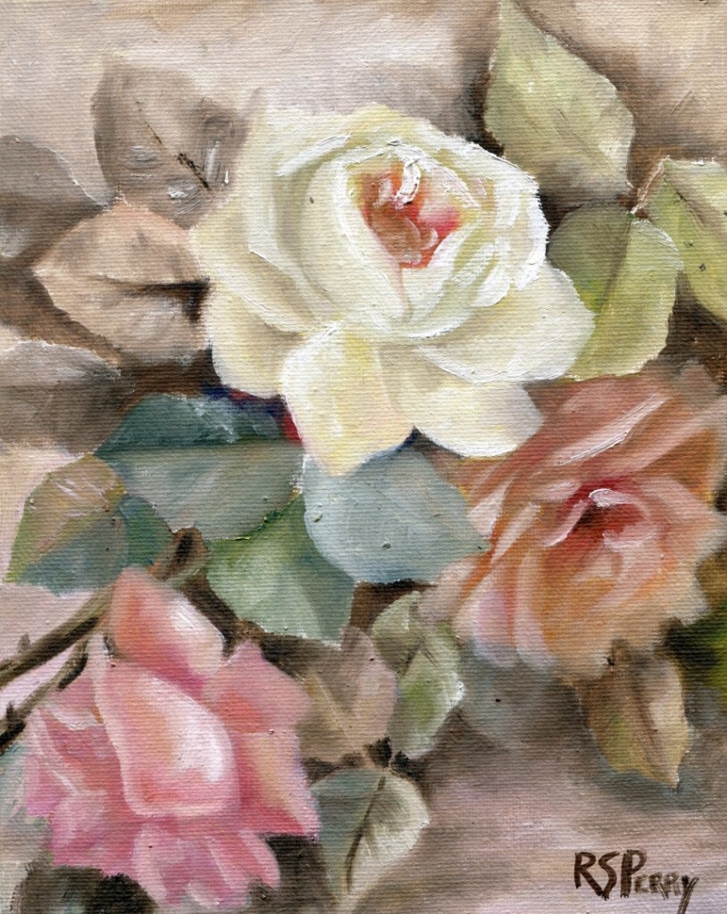 This 10 x 8 oil painting is on a canvas panel. The painting features subtle colors of garden roses. For further information, click here.