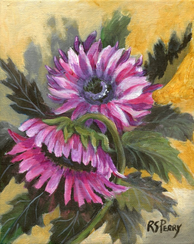 This is an acrylic painting on stretched canvas of brilliant purple red flowers on a gold background. For further information about this painting, click here.