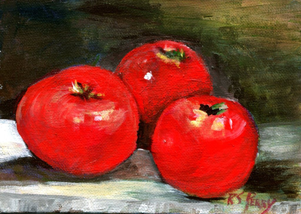 The two apples in the front are honey crisp apples but the apple directly behind them was a solid red delicious (I think). This is a small 5 x 7 painting on canvas panel. For more information, click here.